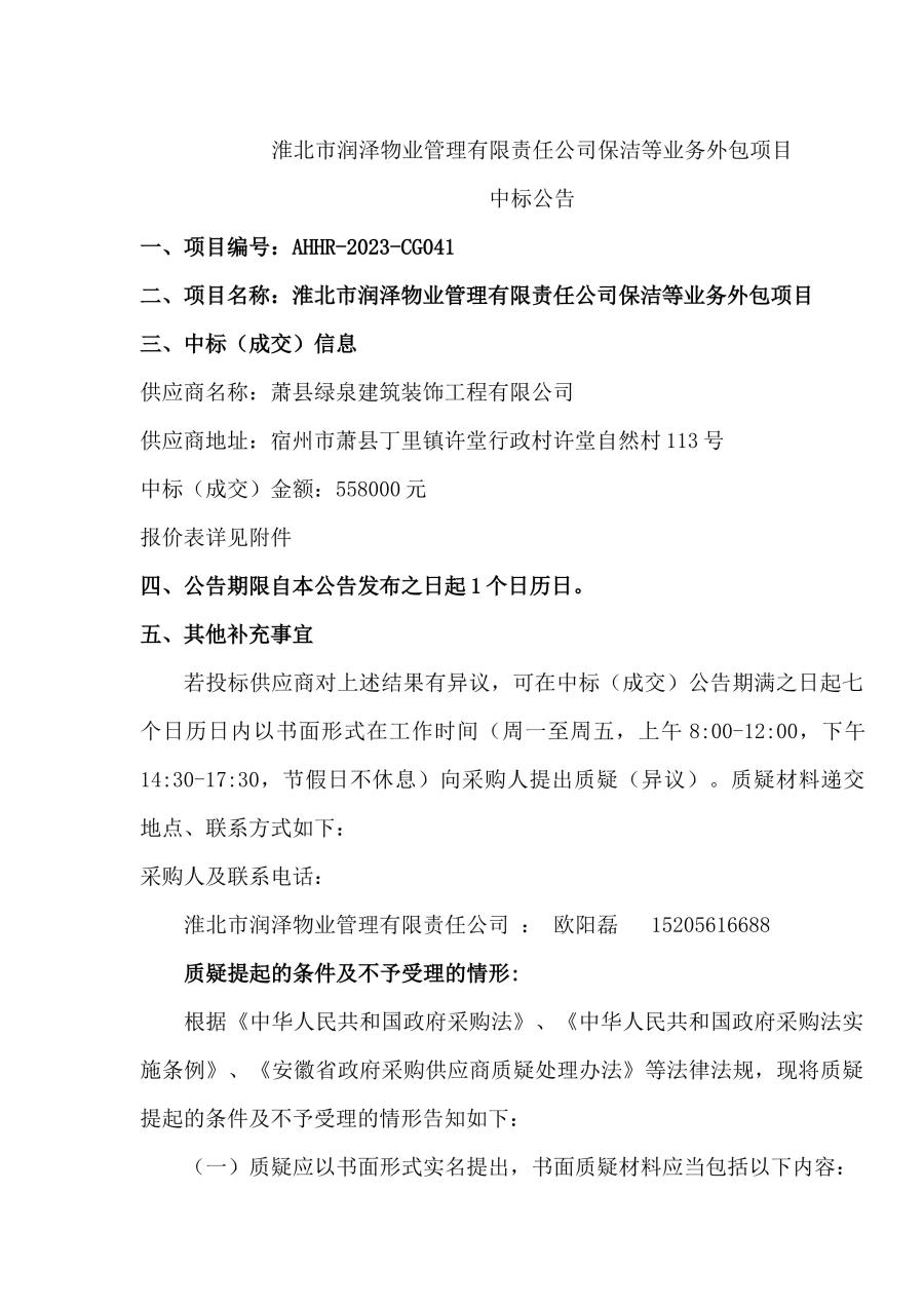 淮北市潤(rùn)澤物業(yè)管理有限責(zé)任公司保潔等業(yè)務(wù)外包項(xiàng)目中標(biāo)公告