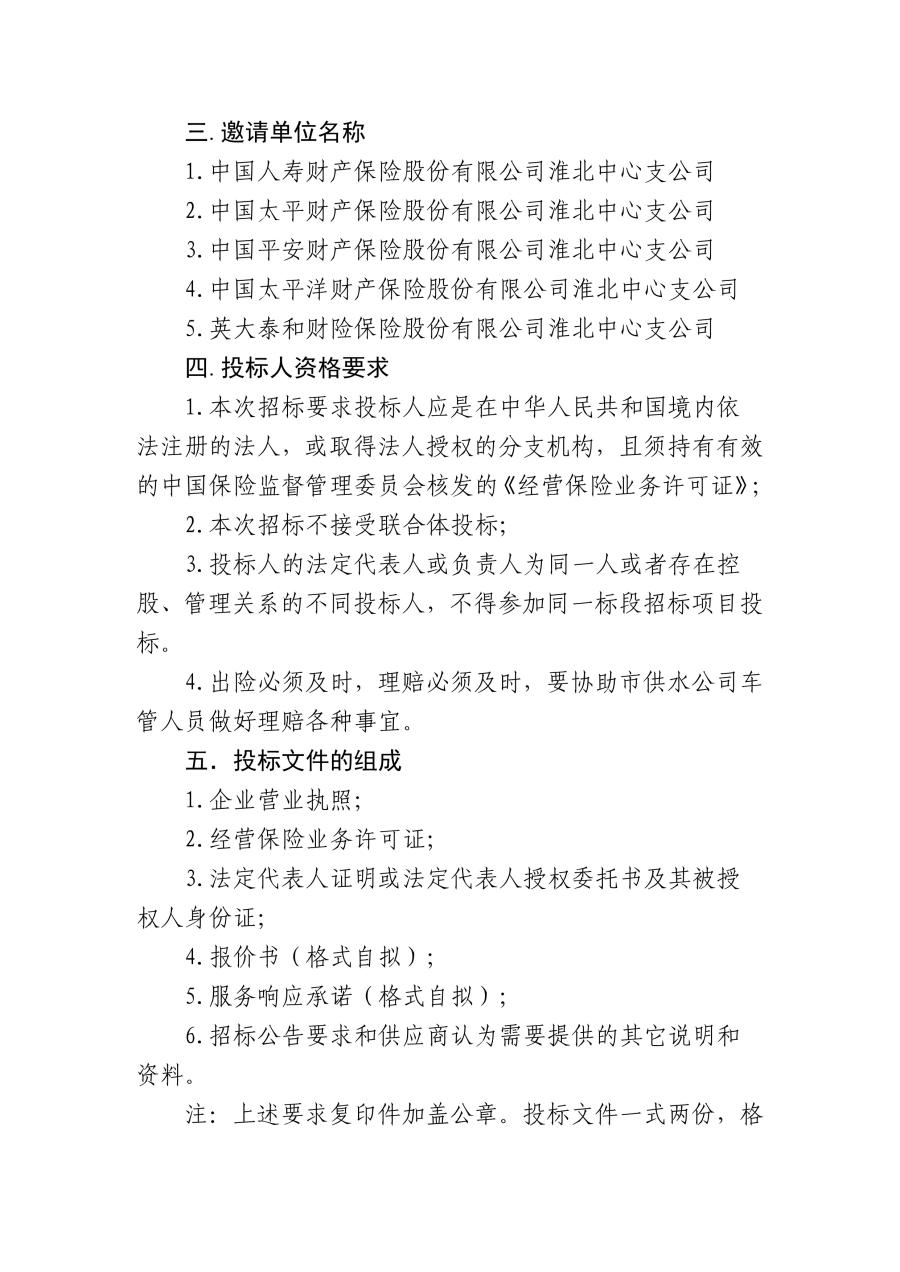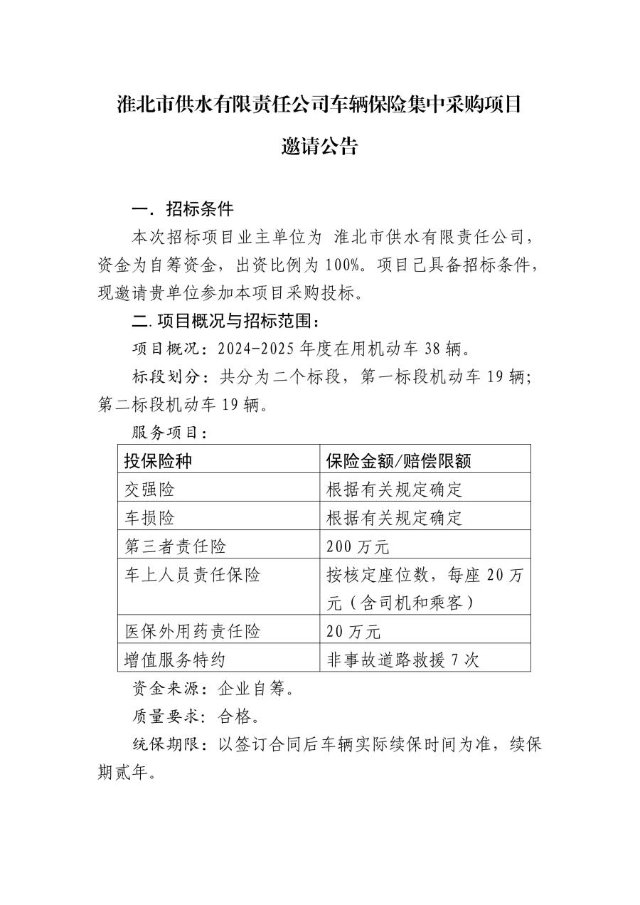 淮北市供水有限責任公司車輛保險集中采購項目邀請公告